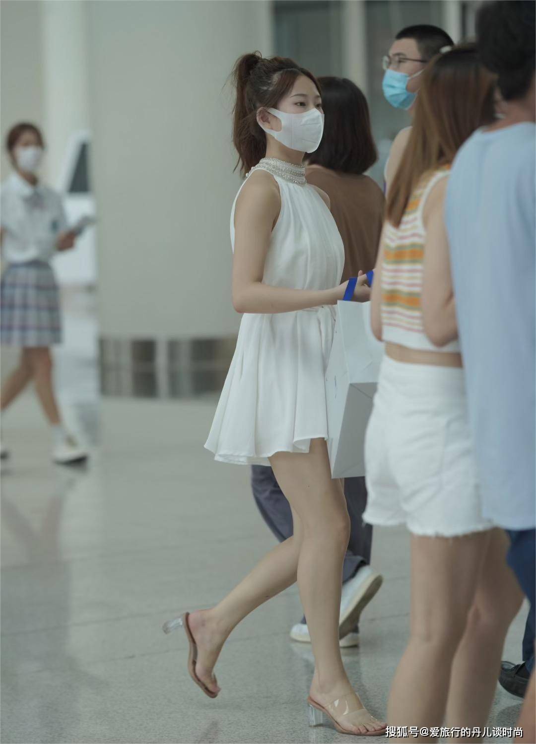 高马尾小姐姐一袭白色薄纱无袖连衣裙,飘逸灵动,领口镶钻的设计时髦动人,搭配高跟凉鞋,仙气满满。